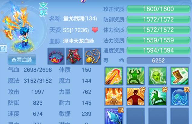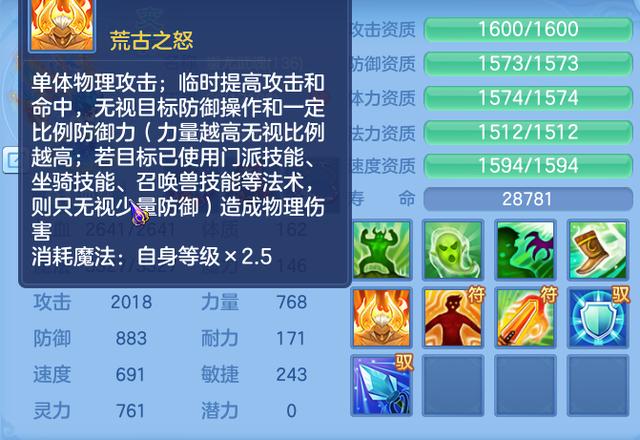 若想打造出一只敏攻鬼魂流的蚩尤一定要有这出色的资质面板,这只蚩尤不仅有着1600高额的攻击资质,体力资质和防御资质更是达到了1572以上,同时还有着接近1600的速度资质。在技能方面,"高级敏捷"能让这只蚩尤在对局中能提前出手,在"高级必杀"+"高级强力"的加持下,使用"荒古之怒"的超高单体物理攻击能对敌人造成巨大的伤害。在PVP竞技模式中,"高级鬼魂术"可以适配有佛门的队友,配合佛门的专属技能"揭谛引魂"可使已方倒地的鬼魂单体复活,倒地后拉起进行继续输出,可谓强强联手。