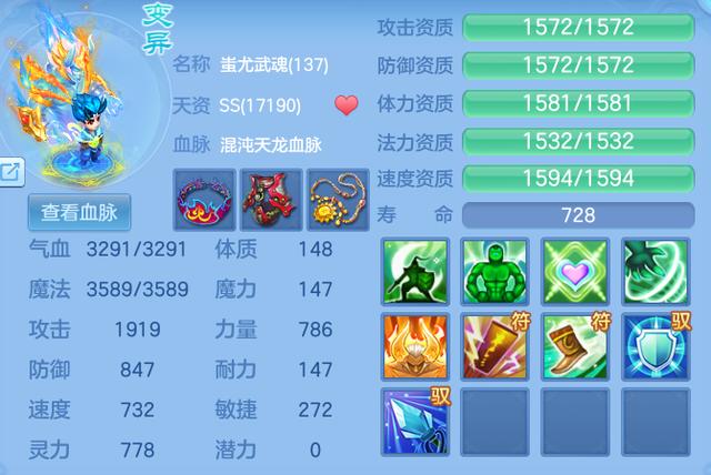 再看看蚩尤武魂暴力敏攻流的打造方式,这只蚩尤的攻击资质防御资质都达到了1572,并且有着1581的体力资质,这位少侠选择了"高级夜战"搭配"高级逆击"来提升这只蚩尤的输出能力,因为高级逆击可以对有祝福类状态的目标造成伤害结果增加20%,在PVP竞技中,能对敌方受到祝福的单位打出更成吨的伤害。再使用"高级强壮"、"高级保命"来提供一定的生存能力,这位玩家加点方面偏向力量和敏捷的加点,在护符技能"高级敏捷"和高额的速度资质的加持下,这也映照出这种打造方式下的蚩尤,对局中的先手能力是不可小觑的。对局开始就能快速使"荒古之怒"削减敌方单位血量,一般人也难以招架。