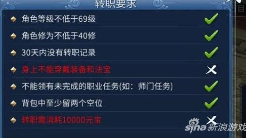 转职后的变化:转职后修炼为0,自动领悟当前等级可以自动领悟的技能,需要技能书领悟的技能全部为0级,经验、帮贡和银票根据修为返还(修炼全部返还,修为大于69全部返还)。