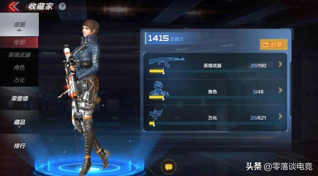 首先进入游戏界面,我们可以看到,人物角色是一个英雄人物零,被称为“双面特工”的传奇特工,在商城中的售价为4080钻。接下来我们来看一看他的收藏库,他的收藏点达到1415,拥有20款英雄级武器,5个角色人物以及20款万化。相信光凭这20款英雄级武器,就能够抵挡一方了吧!
