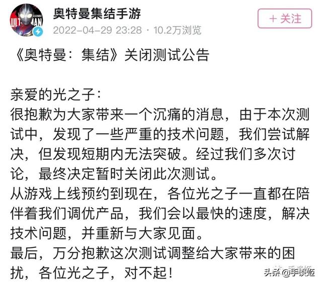 4月29号,一款名为《奥特曼集结》的手游开启了不删档测试;接着不到半小时,官方发布公告说,由于服务器异常,要维护了;接着不到一天,官方又说,问题太严重,测试关闭了。