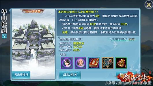 赛制说明本次华山论剑采取三人决斗的赛制,限制战队队员为三名,根据队员的编号与其他战队成员分别对战,出战比赛时,已经上阵的所有同伴可以出场助战,将对手主角和同伴全部击败的一方获胜,如果在规定时间没有击杀对方和同伴,就以战队的伤敌数、剩余同伴数量及输出的伤害值高低论输赢。三人组成战队后,队员会被编上编号,比赛时分别与其他战队对应编号的对手战斗,结束时根据每个队员比赛的输赢决定获胜战队。编号的时候可能会把战力和单挑能力较低的少侠随机对上对方的上等马。降低队友的压力,使已方获胜的几率更高,不过运气也是实力的一种。