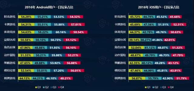 2016年中国移动游戏规模已经增长到819.2亿,比去年多了300多亿,但能够从中分得一杯羹的产品反而变少了。因国家政策的严格把控,中小厂商产品上线率下降;政策规范化又淘汰了一批产品。在这种情况下,一日玩家的占比却在持续攀升,次日留存在不断下降。也就是说819.2亿的蛋糕,中小厂商能分到的更少了。