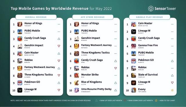 前不久知名移动应用数据分析公司Sensor Tower公布了2022年5月份全球手机游戏营收排行榜。分别分为总排名、AppStore排名和谷歌市场排名,到底是哪些游戏上榜了呢?这其中又有什么奥秘呢?小弟今儿就给大家分析分析!