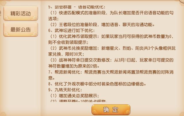 至于其他方面,值得关注的也就是剑会语音优化功能与九转天阶优化了,尤其是九转天阶不仅增加了奖励展示,同时调整了怪物,按理说相比之前是毁容易通关的,也希望大家早日达到理想的段位。