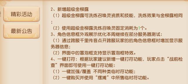 测试服新增超级金柳露这个功能,可以洗炼宠物的资质与技能,相比普通金柳露应该会有多技能方面胚子的概率提升,不过也应该是为了稀有召唤灵准备,获取难度等待后续的信息;一键打符比较不不错,有时候急急忙忙入队,然后又要变卡又要买符,十分不方便,现在有了这个功能就会好多了。