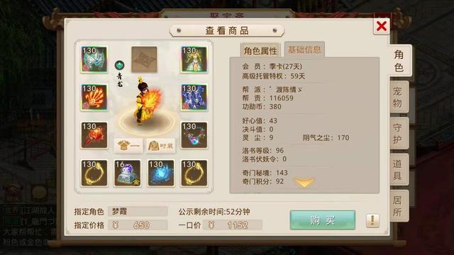 当时小鹿听到这个要求觉得不好办,毕竟我们之前看的那些号底子也就是没有装备宠物的空号都得一两千,所以只能每天逛聚宝斋的时候帮她看看,碰碰运气,不想在前天还真找到了一个合适的角色,花了650元指定了,让我们看看这个号具体怎么样。