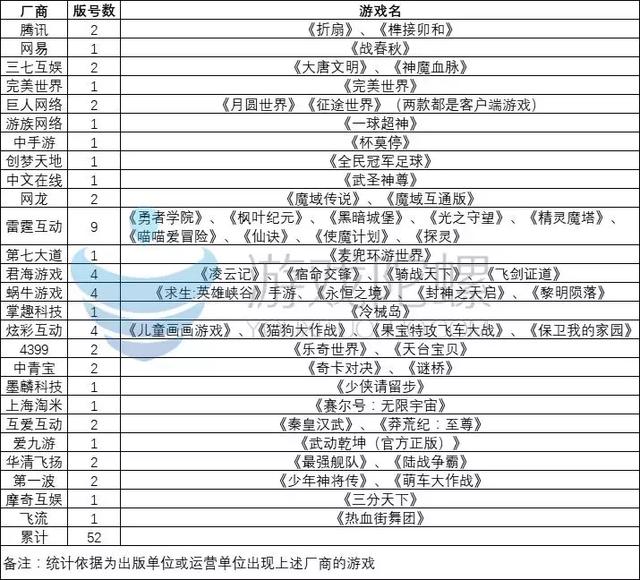 “雷霆互动”获9款过审游戏,成大赢家在获批的328款移动游戏中,大多数为中小厂商的产品,游戏陀螺统计了大部分知名厂商获批的移动游戏,累计为50款,占比为15%,包括腾讯2款,(《折扇》、《榫接卯和》)、网易1款(《战春秋》)、三七互娱2款(《大唐文明》、《神魔血脉》)、完美世界1款(《完美世界》)、游族网络1款(《一超神球》)、中手游1款(《杯莫停》)、创梦天地 1款 (《全民冠军足球》)等。值得提出的是,在获批的游戏中,有9款游戏的出版单位为“雷霆互动”。