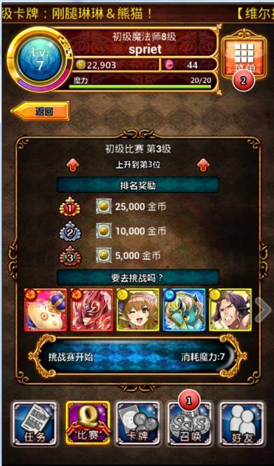 继续昨天的旅程,在进行第三个副本的时候系统出现提示:魔法师等级不够,需要参加全国挑战赛来提升自己的魔法师等级才能继续后面的副本。其实第一次听说要参加全国挑战赛我是拒绝的,因为,不能你让我去,我就马上去,第一我要试一下。我不愿参加以后再加一些风险进去,对战时“咣”的一下被人KO,这样一定会不开心,根本就不想玩下去了。后来我参加了大概3次左右, 感觉还不错,拿到第一有2W5的金币,经验也还好,我要让大家知道,我参加之后是这个样子,你们参加之后也是这个样。