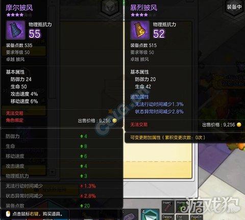 上去是本人暴烈披风和这个糊涂币换取的50级摩尔披风的比较参照、可以发现装备点数一个是535,暴烈是515。暴烈的属性附加属性是随机的。
