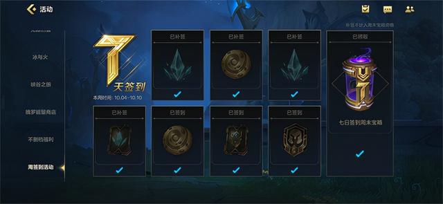 在活动中心最下方可以看到游戏中固定推出的每周签到宝箱活动。本活动会以7天为一个固定周期,玩家只要每天进行签到即可解锁相应奖励。错过的可以用蓝色晶石进行补签。周末会推出七日签到周末宝箱,宝箱中可以随机开出蓝色晶石、魄罗币、全英雄畅玩卡、史诗皮肤臻享卡、队伍加成卡、英雄自选礼包等丰厚奖励。未来还会推出针对新手玩家的8日签到活动。玩家签到累积满8天将会解锁英雄厄运小姐以及“西部牛仔 厄运小姐”皮肤。