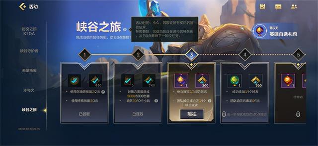 峡谷之旅活动是一个永久活动,在活动界面清晰地列出了玩家获取活动奖励所需要在游戏内达成的相关条件。例如对英雄造成指定数值伤害、消灭指定数量小兵等。玩家只要达成目标就可解锁相应奖励。当玩家达成所有目标以后,次日0时会刷新任务进度,推出全新的目标与奖励。这个任务可以在玩家逐渐深入了解和学习游戏的过程中带给玩家不少帮助。例如指引玩家消灭峡谷先锋的任务就会让玩家有意识地接触到峡谷先锋的相关机制。