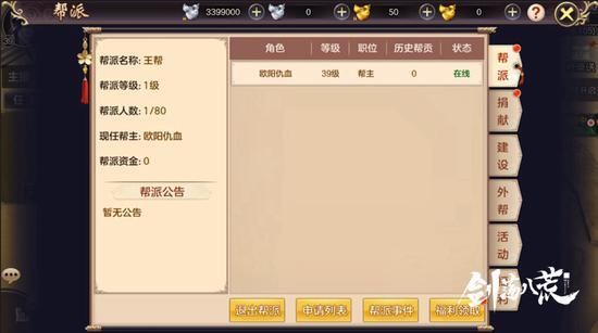帮派系统是《剑荡八荒》中比较大型的社交系统之一,当玩家达到指定等级后,可自行创建或通过“帮派”按钮申请加入帮派。加入帮派后,玩家可以和帮派成员一起参加各种日常活动,获得经验和金钱奖励并增进团队感情;还可以通过捐献获得帮贡,从而兑换相应的游戏道具,学习帮派专属技能,提高人物属性等。此外在帮派中,玩家还可以根据贡献、等级等筛选出与自己相近的伙伴,从而加为好友。最后,帮派还设置了专属的聊天频道,方便帮派成员一起参加某个活动时互相沟通、交流。