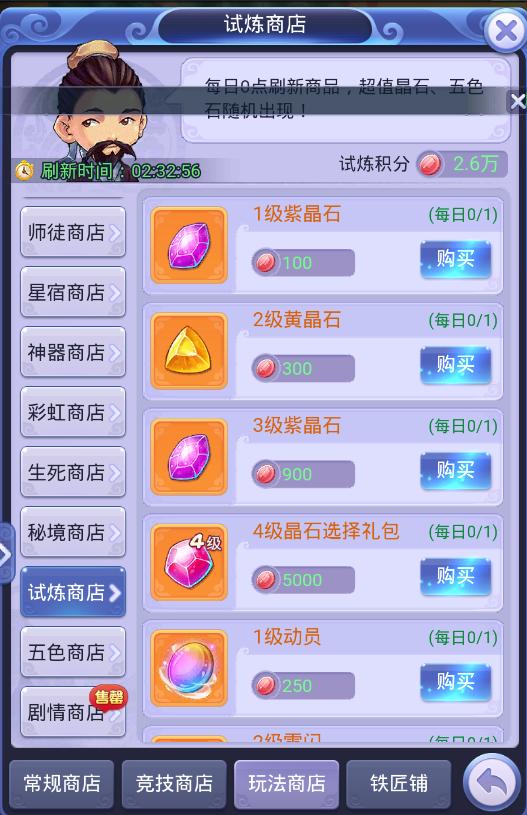 试炼积分可以在主城-商会-玩法商店-试炼商店兑换晶石、五色石、月华露、糖心丸等道具。