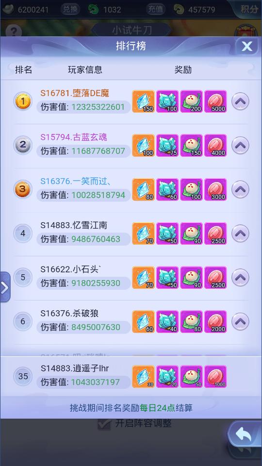 伤害前100名,进入榜单的玩家可获得额外的宝石精华、硝石、糖心丸、挑战积分奖励。