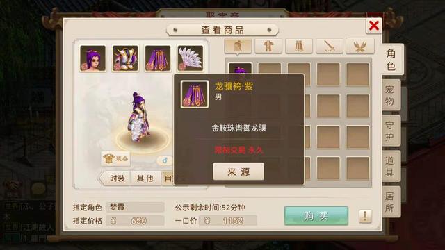 这个角色还有一套永久时装,龙骧套,骚紫色,配一套时装也得三百来块了。
