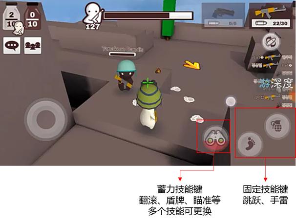 此外还有三个功能键,包括两个固定功能键“跳跃”和“手雷”,和一个蓄力大招键(可在翻滚、盾牌等多个功能中选择)。