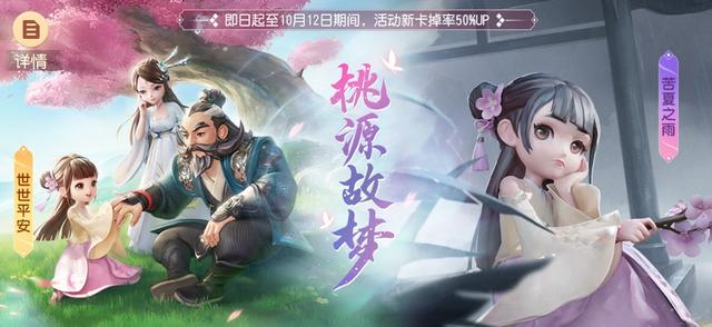 行历卡池又上新啦!镜中寻缘全新卡池【桃源故梦】开启,特定新行历卡限时概率提升,本期卡池即日起将持续至2021年10月12日12:00。本期概率提升行历卡:金色行历卡【世世平安】占所有金卡出率的50%;紫色行历卡【苦夏之雨】占所有紫卡出率的50%。其中【世世平安】装配词条为情绪【合】、三界【三界】、缘分【秦漓】、时辰【夜雪·戌时】、五行【木】,装配属性分别为治疗、法防、法术命中、法术化解、物理格挡;【苦夏之雨】装配词条为情绪【悲】、三界【南瞻部洲】、缘分【袁天罡】、时辰【夜晴·戌时】,装配属性分别为物攻、气血、法术躲避、法术化解。【世世平安】、【苦夏之雨】均同步加入常驻卡池,但在常驻卡池中不享受概率提升。全新行历卡又会带来怎样的新奇搭配呢?少侠们快来搭配体验吧!