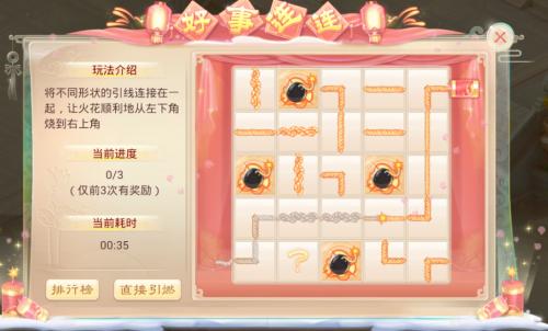 点击任务栏即可进入好事连连趣味活动界面,将不同形状的引线连接在一起,让火花顺利的从左下角烧到右上角引燃烟花即可完成任务。每天可获得3次奖励,但是活动不限次数。