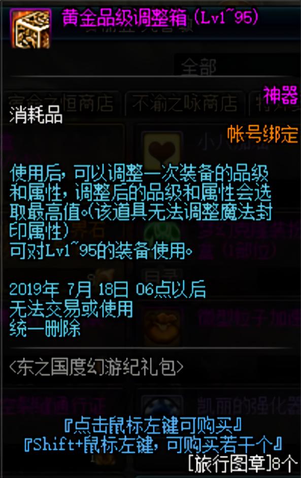 8个旅行图章可以兑换1个黄金品级调整箱,这一个是95级可以使用的哦,大家在95版本都换了苍穹武器了,那么这一个100%品级的调整箱是必须要入手的了,不过200一套才能换1个,而且一个账号只能换1个,有点坑。