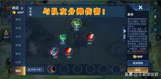 看似是一件辅助装备,其实星泉的效果注定了这是一件坦克必备神装,众所周知,坦克在后期放完技能之后,基本就是一个活靶子,即便是血量再高,也只能依靠普攻输出,但星泉的出现却可以让坦克血量有着更多的作用,当团战中为射手开启后,坦克就会为射手分摊50%伤害,同时,还会为射手提供20%的免伤,综合起来70%的伤害减免,即便是猴子都不一定能秒掉脆皮射手了!