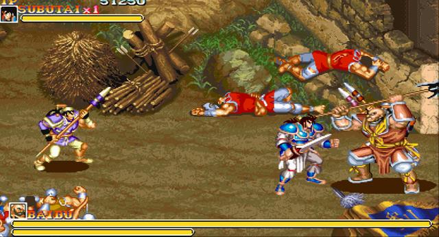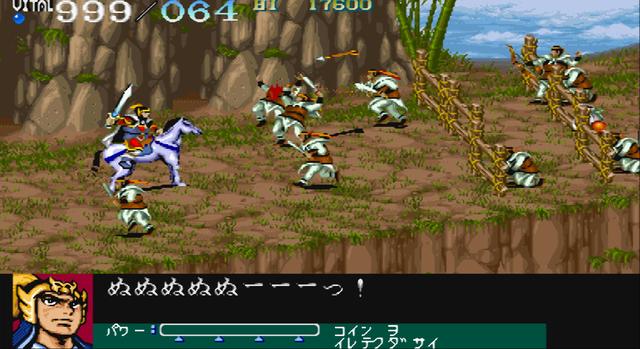 既然叫“2”,那么肯定就有“1”。街机上的1代发售于1989年,可选角色有桃园三兄弟再加个赵云,三个按键分别对应“向左攻击”、“向右攻击”和“放大招”。我们要做的就是骑在马上一路劈砍,画面会自动向前推进,与其说是动作游戏,不如说更像射击游戏,还有部分成长要素,角色可以涨经验值并升级。