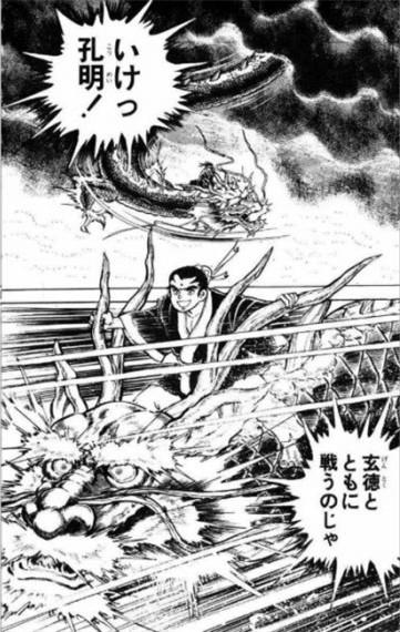漫画《吞食天地》是本宫宏志(也译作本宫广志)于1983年在《少年JUMP》上连载的漫画,虽然故事背景是三国时代,但剧情实在太天马行空:刘备与诸葛亮少年时便相识,分别搞上了龙王的女儿,进入天界,一个获得了过人的胆识,一个获得了无比的智慧。后来刘备结识关、张,一起讨伐黄巾军,发现张角的背后竟然是魔界在撑腰,于是伙同诸葛亮杀入魔界,干掉魔王幻钟。幻钟的身体分裂为一百零八块(多么醒目的数字),附在了董卓、曹操等豪强身上,风云乱世就此拉开序幕……