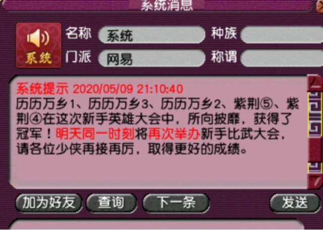 “新手英雄大会”和“英雄比武大会”有所不同,新区第二天大家最高也就39级,药品也以2级药和金创为主流,而且这时还没有解封药品,所以新手英雄PK中,封系和LG炸蓝流都是夺冠热门,最终为期三天的比武都是“历历万乡1”带领的队伍夺得桂冠!