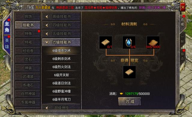 玩家从界面下方的“合成”图标,可以进入到技能书的合成界面,找到自身职业的高级技能来合成的。大家合成各种高级技能书,需要准备好对应的材料。技能书合成主要消耗技能书页、气之结晶、顿悟印记等材料,越高级的技能书合成,消耗越多的技能材料。此外,每个职业还有一项超级神技,这些神技的技能书,也可以利用技能书页和神技书页合成,不过神技书页获得较难,要通过运营活动获取的。