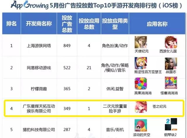 而对于这款产品的秘诀,很多人将其归结为买量之上,据App Growing发布《手游行业买量市场洞察》报告显示,星辉游戏于2018年4月至5月广告投放总数排名均在第4,而《苍之纪元》成为过去两个月星辉买量投入最大的手游之一。