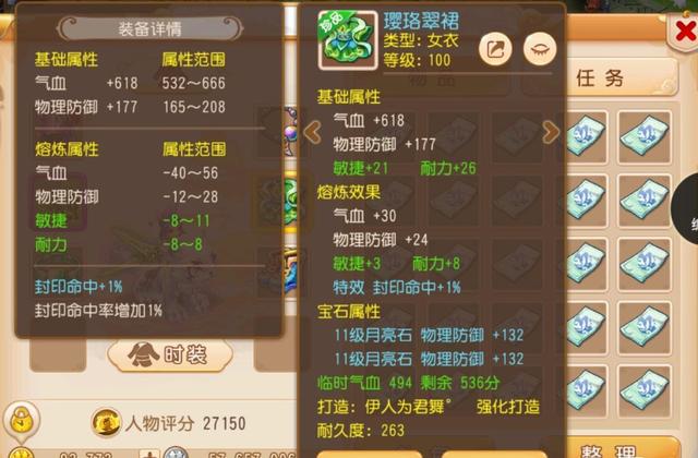 接着晒出的是一件100级的衣服,同样有较高的敏耐绿字属性加成和封印命中特效提升,并且经过熔炼后物理防御属性加成也达到了201点,再加上两颗11级的月亮石,大大提升了角色的物理防御力。唯一遗憾的是没有特技加持,不然就是一件完美的方寸“毕业神衣”!