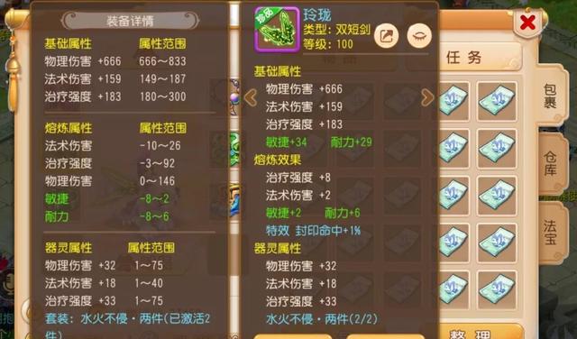 首先来看看武器,所携带的这把100级的双短剑还是很不错的,除了71点的敏耐属性双加外,还有封印命中+1%的特效,能够提升不小的人物战斗表现。并且这把武器还镶嵌了水火不侵两件套器灵,能够增强自身等级*100%的法术防御属性,在战斗中生存能力更强。