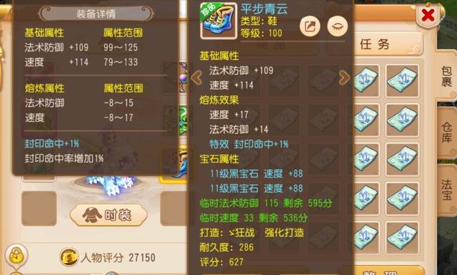 接下来晒出的是一件100级的鞋,除了拥有封印命中特效加成外,属性更是亮眼!其中速度属性加成已经达到了131点,再加上两颗11级的黑宝石,能够让角色在战斗中拥有率先出手的机会。
