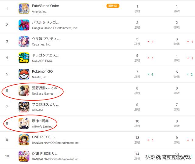 日本畅销榜上,网易《荒野行动》排名第6、米哈游《原神》排名第8。