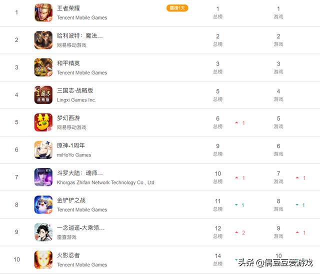 今天前10名腾讯占据4席、网易2席、米哈游、阿里游戏、三七游戏、雷霆游戏各占1席。
