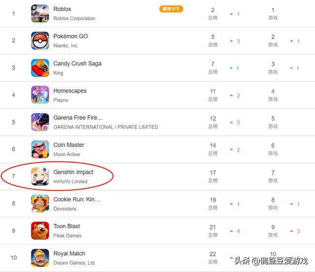 美国畅销榜上,米哈游《原神》与昨天持平、排名第7。