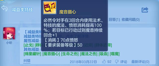 最后说说特技,在PVP中愤怒是非常重要的,因此在恰当时机使用“绵里藏针”减少敌方愤怒,就能限制敌方释放法术和特技,打乱敌方的战术。“魔音摄心”则能增加敌方愤怒消耗,减少他们使用法术和特技的机会。这两个特技都是封系的首要追求。