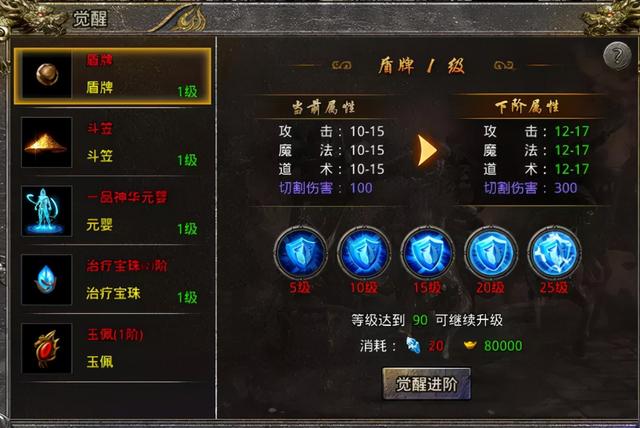 玉佩、盾牌、斗笠、元婴、治疗宝珠此五件配装备可以觉醒,觉醒后会额外的增加攻击和切割伤害。当单件的觉醒等级达到5级/10级/15级/20级/25级时可以获得强力特殊技能。配饰的觉醒需要用到觉醒之石,元宝。