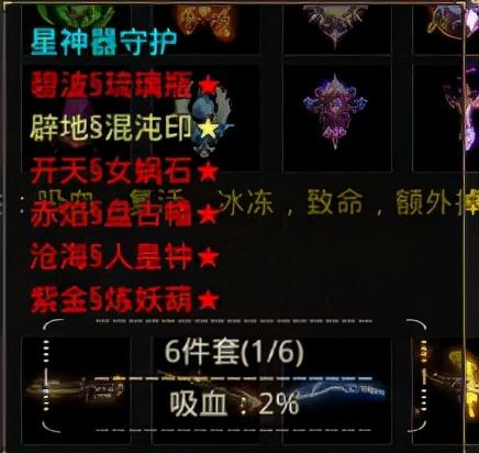 收集:碧波·琉璃瓶、辟地·混沌印、开天·女娲石、赤焰·盘古幡、沧海·人皇钟、紫金·炼妖葫 可以获得套装效果加成2%吸血属性
