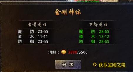 金刚身体的等级提升能增加防御值和攻击,提升需要消耗金刚之精