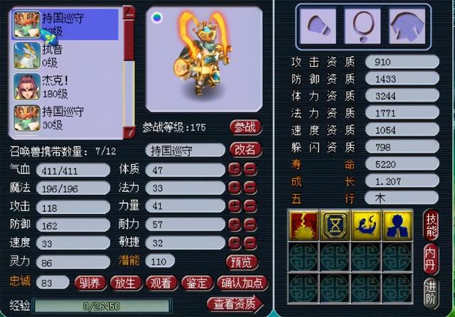 小编先给大家说一下上面的这组炼妖其实是一组打书失败之后的回炉,那只七技能的执音之前是拥有须弥真言的,只不后来又通过打书的方式给打掉了,现在又进行了回炉,只执音必带的技能已经被打掉了,另外一只四技能拥有的须弥真言的持国巡守,所以合出来的召唤兽造型如果是执音,技能的数量最多能够达到13个。
