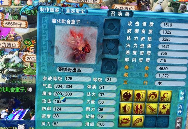 上面这只召唤兽的造型是魔化毗舍童子,需要使用毗舍童子跟魔族的召唤兽进行炼妖才能够获得,而且上面的这只10技能的魔化毗舍童子已经被打成全红了,现在拥有的力劈华山、无赦魔决和壁垒破击三个召唤兽的特殊技能,无赦魔决的作用是攻击目标神佑时会降低20%的气血上限,这一个技能没有必要专门去弄,打完全红能够保留下来是最好的,这样的力劈壁垒的毗舍童子可以用来克制女魃墓召唤出来的幻魔。