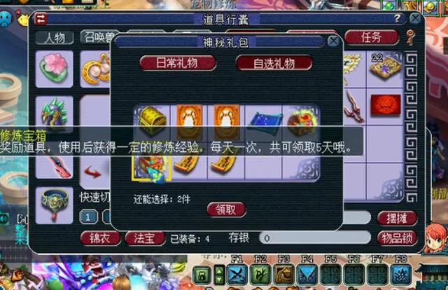 还有一个神秘礼包,礼包里面包含好几种奖励,比如修炼宝箱、锦衣折扣券、机缘宝箱等。玩家只能选择其中的两件道具。