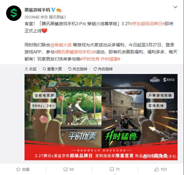 3月23日上午,黑鲨官宣:腾讯黑鲨游戏手机3 Pro穿越火线尊享版将于3.27京东超级品牌日正式上线,独家限量,6期免息。