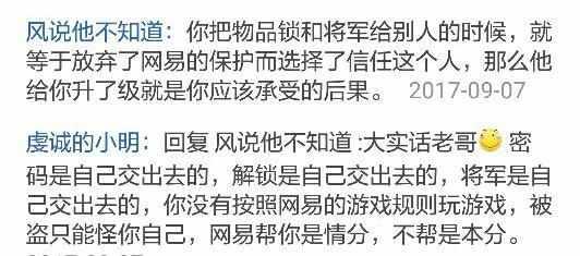 一位名字叫风说他不知道的网友说,你把物品锁和将军令给别人的时候,就等于放弃了网易的保护而选择了信任这个人,那么他给你升级就是你应该承受的后果。