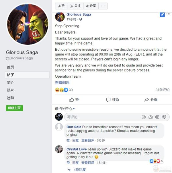 昨日被爆出涉嫌抄袭《魔兽世界》的手游《Glorious Saga》已在官方Facebook发表了声明,确认游戏现已停服。