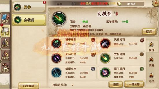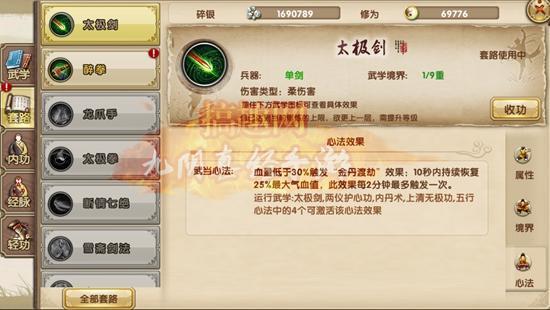 首先点击进入武学套路的界面,这时候会看到所学习的套路太极剑和醉拳。那么这时候选择要替换掉的武学然后点击右上角的收功。