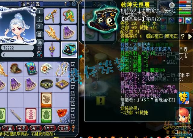 120级太极护法机关鸟套鞋子,仅打了4锻黑宝石,固伤门派一般都会选择全敏加点,所以速度会很快,鞋子也没必要打太高锻数的黑宝石。甚至有的任务固伤会选择打神秘石,增加躲避。
