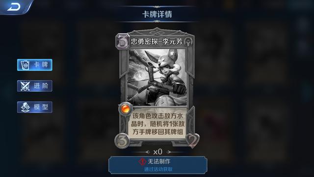 这一赛季的积分探宝,李元芳强势回归。别看元芳小小的个子,其实可有着大大的能量,攻击敌方水晶时,随机将1张敌方手牌移回其牌组,要是没有第一时间消灭他,那可别奇怪手上的好牌怎么都没有了哟!