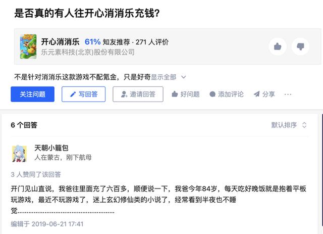 在知乎上,84岁的老爷爷在消消乐氪金六百块,每天吃完饭就抱着平板消消乐。